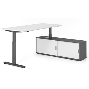 Der Steh-Sitz-Tisch mit Sideboard 'Hit-Jive Modern' ist der perfekte Partner für die ergonomische Arbeit. Die Kombination aus einem Schreibtisch und einem Sideboard mit Schiebetüren bietet alles, was ein moderner Arbeitsplatz braucht. Dank der elektrischen Höhenverstellung können an diesem Arbeitsplatz viele verschiedene Haltungen eingenommen werden, was den Rücken entlastet und den Kreislauf anspricht.